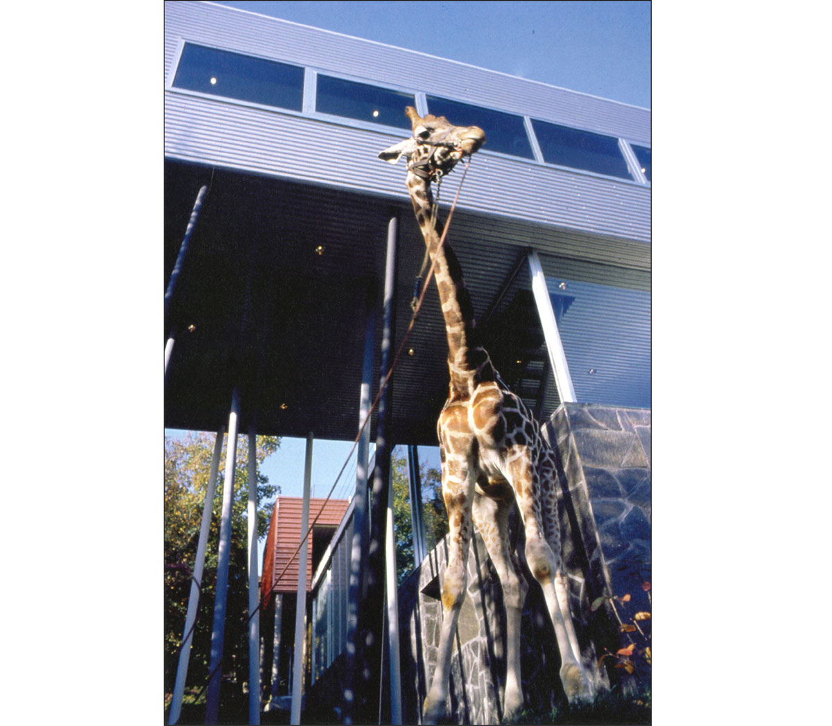 Koolhaas was also concerned that the seductive power of the film images might overshadow the architecture of the villa, and he had mixed feelings about the way the short film and photographs represented it. In particular, he was intrigued by the giraffe, which he still considers ‘retrospectively interesting’, perhaps because he recognised that it, like the other wild animals in the script, could enhance the meaning of architecture, much like the famed gorilla in King Kong did for the Empire State Building (Biló and Koolhaas 2004, 114).40 That he thought wild animals could do as much is suggested by OMA’s use of animals like gorillas and kangaroos in the villa’s collages to transform the pilotis into a forest and the driveway into a plain, thereby turning the villa into an architecture capable of integrating itself into ever-changing landscapes, as if undertaking a journey with different stages. These animals would continue to appear in OMA collages (Lampariello 2011). Yet Koolhaas did not approve of the apparent domestication of the giraffe that was suggested by its having been kept on a leash in the film (see Figure 1), and the only photograph of the giraffe he used in S, M, L, XL (OMA, Koolhaas, and Mau 1995, 150–151) depicts it as an enigmatic and elusive figure behind the glass giving it the appearance of a dream-like presence intended to evoke the villa’s unconscious personality.41 The choice to stage the giraffe in the driveway, where Le Corbusier would have placed one of his modern automobiles to express his vision of architecture as a machine à habiter, clearly reveals Koolhaas’s ambition to devise a new form of modern architecture, now unexpectedly animated by fantastical wildlife.42