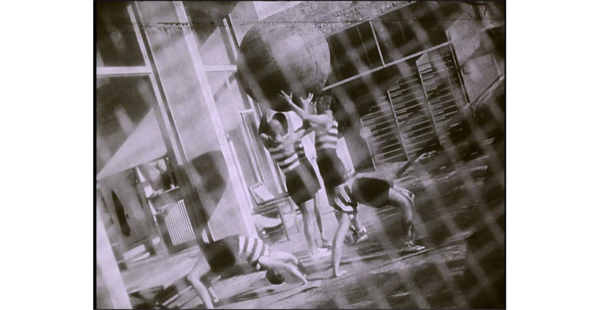 Bathers wearing long striped costumes and dark tights on their heads play on the roof of the Villa Noailles. Still frame from Man Ray, Les mystères du château de Dé, 1929. © SABAM Belgium 2024.