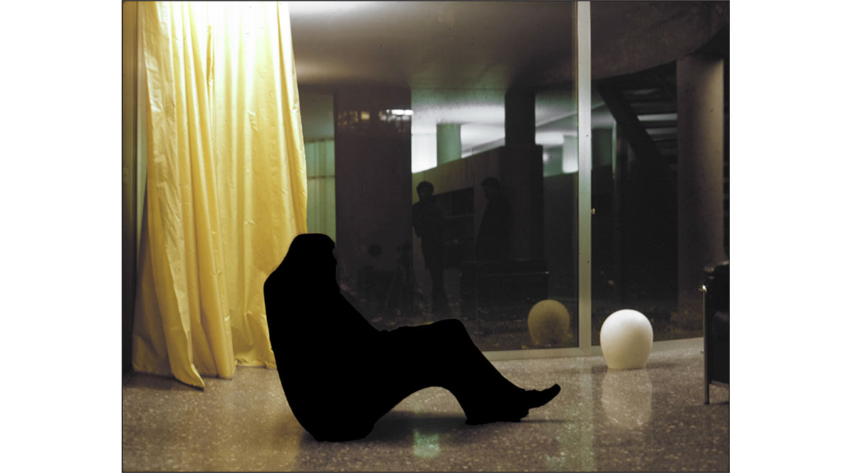 Another prominent figure in the short film and in some of the photographs is a white ovoid shape that also appears in paintings and photographs of Man Ray.34 This shape, rendered as an element extraneous to the domestic context of the villa, is at times represented next to a black figure — an effect Werlemann was able to produce by merging the tongue chair and a seated person (AHW LAVA6×6404) (Figure 13) — that again evokes the veiled characters of Les mystères du château de Dé.35 The completely white and smooth strange shape that suddenly appears in the short film as if from an alien world, in perhaps another allusion to 2001: A Space Odyssey, seems analogous to the mysterious monolith, shiny and black, that falls from the sky in another scene in 2001: A space Odyssey and that reveals a new way to live to the villa’s inhabitants. The ovoid shape, which functions as a monolith in the film representing the villa’s domestic avant-garde, was the model for the competition project for the Zeebrugge ferry terminal that OMA exhibited at the Institut français d’architecture in Paris in 1990. It was brought to Saint-Cloud to be integrated in the short film, and for Werlemann, it likely harked back to the egg in OMA’s 1975 founding manifesto. Werlemann’s determination to include ovoid shapes in the recording, also reflected in a still from the film of a white motorbike helmet (AHW LAVA6×6493), stems from his interest in the origins of that Koolhaasian theory that aimed to redefine the foundations of domesticity, a theory that found one of its first concretisations in Villa Dall’Ava in Saint-Cloud.36