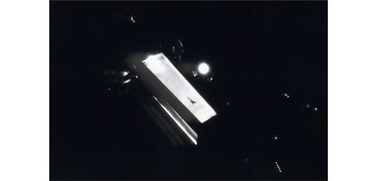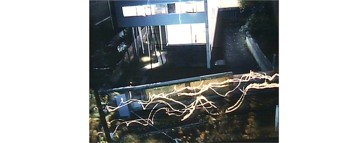 Long exposure photograph depicting light trails in front of the villa. Still frame from Hans Werlemann and Claudi Cornaz 2042: The Villa Dall’Ava, 1992. Claudi Cornaz Archives, Rotterdam. © Hans Werlemann, © Claudi Cornaz.