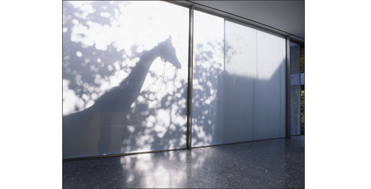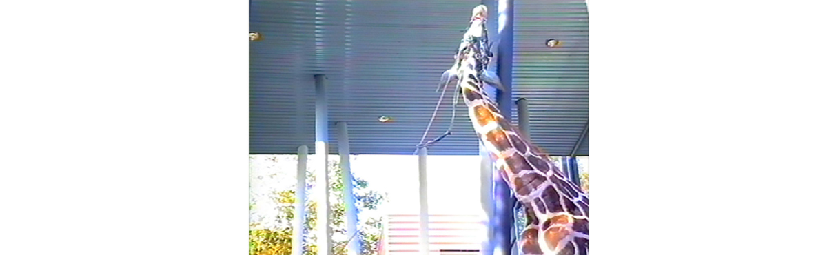 Giraffe rubbing against the villa pilotis. Still frame from Hans Werlemann and Claudi Cornaz, 2042: The Villa Dall’Ava, 1992. Claudi Cornaz Archives, Rotterdam. © Hans Werlemann, © Claudi Cornaz.