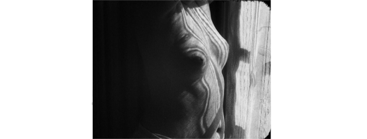 The short film reflects the unexpected association of geometric figures common in Man Ray’s films as in the polygonal slate slabs of the plinth and the spots on the giraffe’s skin, the waves of the aluminium and polycarbonate panels, the circles of the porthole and the holes in the ceiling, and the diagonals of the pilotis and handrails. These unexpected associations are reinforced by Werlemann and Cornaz’s transformation of the villa’s living room from a transparent glass house into a phantasmagorical screen that renders the shadow of the giraffe on the outside mysterious and even frightening (Figure 5). In this game of superimpositions reminiscent of Man Ray’s cinematic techniques, the giraffe plays a crucial role. Represented in the form of a dark, irregular spot, it superimposes itself on Werlemann’s head, forming a chimeric figure, half animal and half human. Such metamorphoses occur throughout the film, hinting at the transformation of the villa into a ‘personality’, evoking the idea of the building as a body, and establishing a distant dialogue with Man Ray’s work. Kiki de Montparnasse moves in the shadow of a striped curtain in Le retour à la raison (1923), while the villa in 2042 is protected by Blaisse’s yellow curtain with brise-soleil shadows and comes alive like the body of a person (Figures 6 and 7). Like Mademoiselle Dorita who clings to a snake in a 1930 Man Ray photograph, the giraffe wriggles and rubs against the pilotis, suggesting the transformation of those columns into human limbs (Figures 8 and 9). The association of the giraffe and staircase that transforms the stairs into the spinal column of the building-personality recalls the superimposition of a starfish onto parts of the human body in L’étoile de mer (1928). Like Man Ray, Werlemann, whose family founded the Amsterdam zoo, makes recurring use of exotic and wild animals in his work.29
