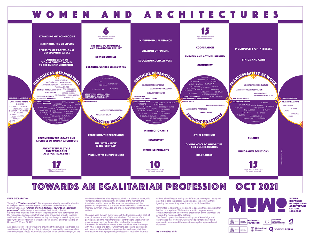At the same that she oversees the research work and the building of the map, Moreno also organises meetings at which the results of the MuWo project and the work of professionals interested and currently working in this field are disseminated. Since 2017, five conferences on the subject of gender perspectives in architecture have been held both face-to-face and online featuring historical overviews, accounts of urban planning and institutional policies, and discussions of editorial practices and critical pedagogies, among others. In addition, in October 2021, under the auspices of the MuWo project and with the collaboration of the Fundación Arquia, the first Congreso nacional mujeres y arquitecturas called ‘Hacia una profesión igualitaria’, which more than 80 national and international professionals in the field of architecture took part in, was held in the digital space of the foundation, EspacioFQ.com. The virtual nature of the congress reflects the project’s objective of using digital platforms to disseminate its results as widely as possible. The subjects covered and the presentations delivered at this congress are visually captured in an infographic that appears on the project’s website (Figure 2).